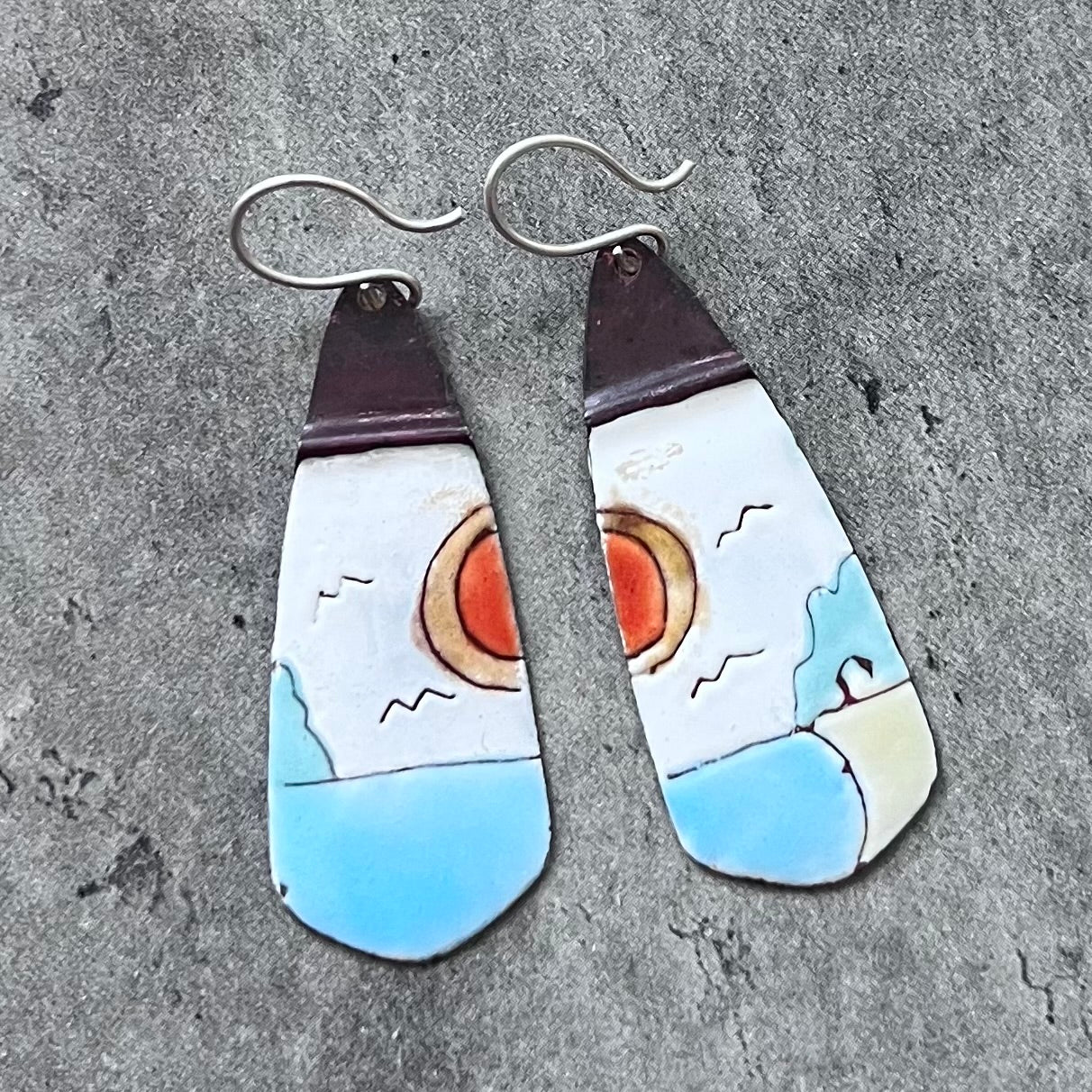 Dreams of Christmas Cove earrings--a wearable tribute to this shoreline and timeless moments. Handcrafted enamel on copper, with sterling silver ear wires, captures the enchanting vista of Christmas Cove, looking both north and south. At .625" wide by 1.5" long, these feather-light earrings offer all-day comfort. Add a whisper of wonder to your own style or gift someone special a piece imbued with the lakeside nostalgia. Embrace the spirit--make Dreams of Christmas Cove yours today!