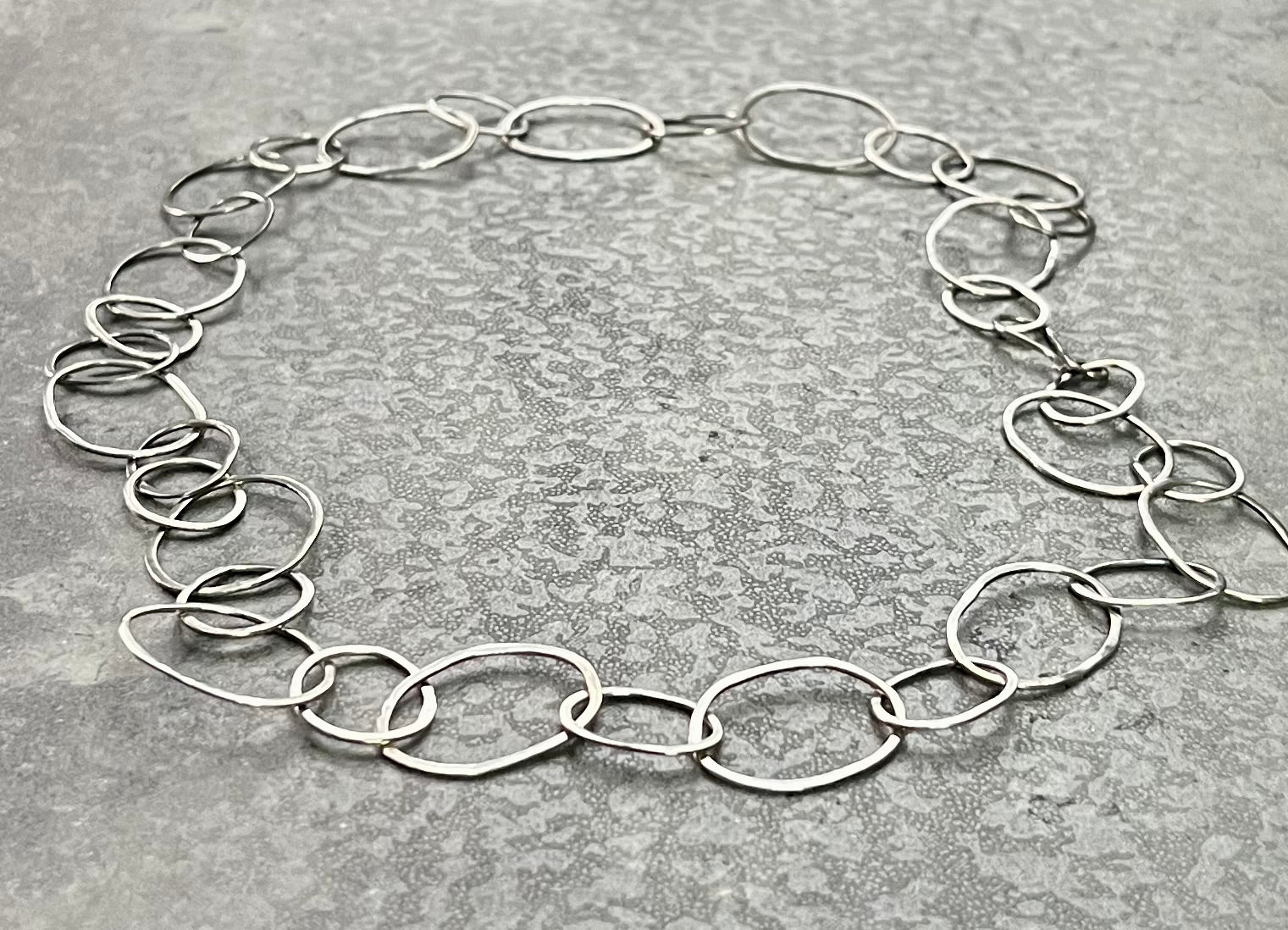 Large Loopy Link Chain—a testament to modern elegance. Crafted from sterling silver, each link is hand hammered, resulting in a luminous texture that captures and reflects light with every movement. This chain adds playfulness to an ideal statement piece for those who appreciate both creativity and design.
